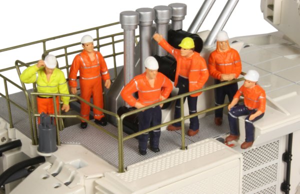 Mounted low down within the chassis is the powerful diesel engine with plenty of service space provided in the compartment, complete with a folding front access ladder while ladders also lead to the upper works which are surrounded by scaled metal safety railings and service walkways giving access to the dominant exhaust and air intakes rising up into the air. The large side panels have a fine etched grill pattern which really looks authentic and offers glimpses of the interior.