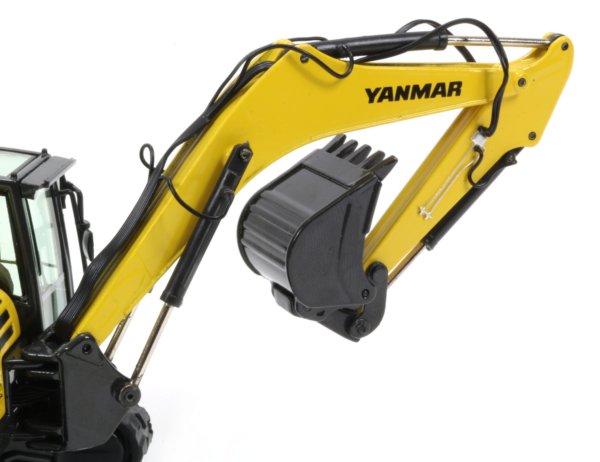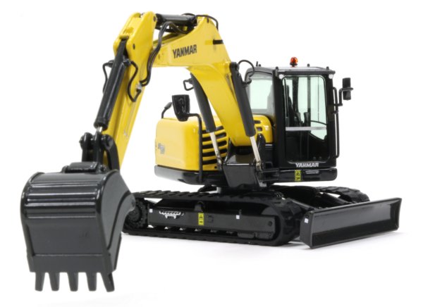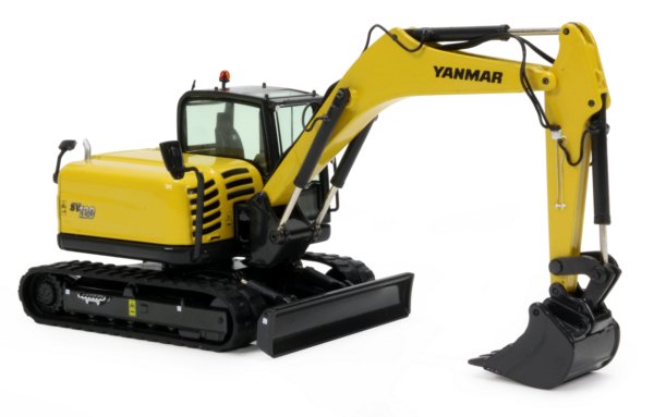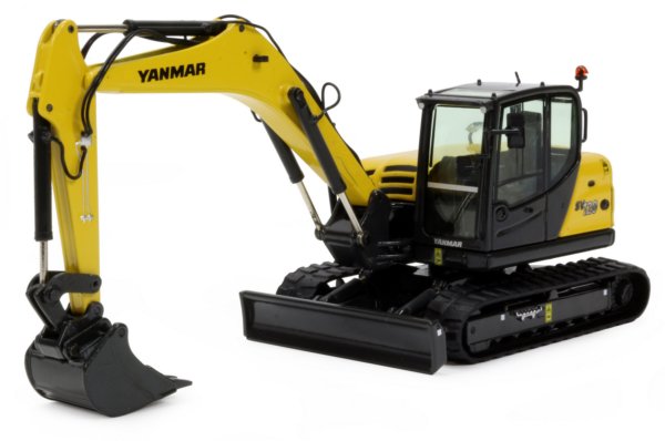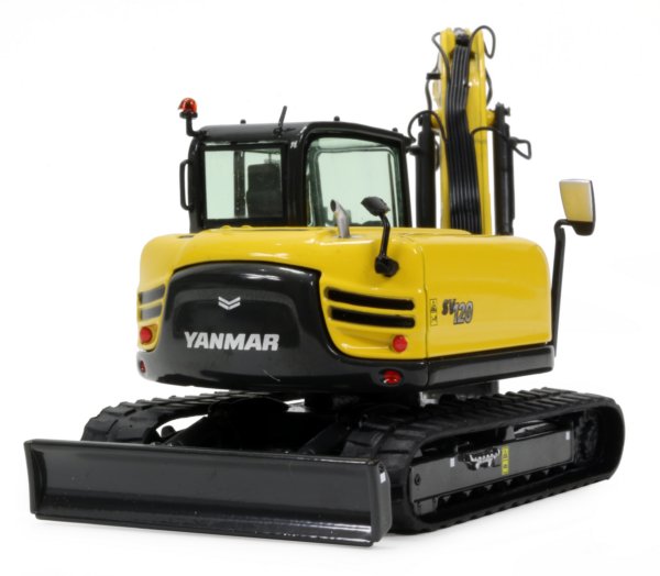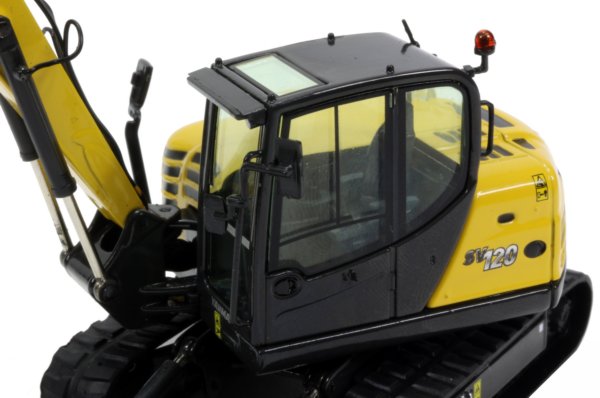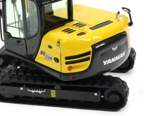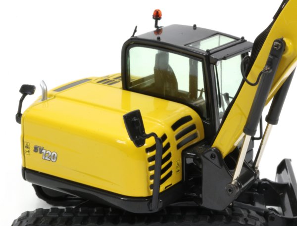Yanmar SV120 Tracked ExcavatorPresented here is the 1:50th scale Yanmar SV120 tracked midi excavator which has been produced by NZG. The SV120 is the new name for what was the former Terex TC125 and is the largest machine in the Yanmar range, weighing in at 12,500kg. It is powered by a 116hp Deutz TCD3.6 L4 diesel engine and has a maximum dig depth of 4.33 metres. The compact dimensions and zero tail swing design make the SV120 ideal for trenching and excavating in confined jobsite's while the dozer blade allows for quick leveling. The undercarriage of the SV120 is fitted with a dozer blade which is height adjustable with rubber band style tracks that have surface detailing added to the track frames which have rotating drive and idler wheels, silver finished access step and tiny printed safety markings.